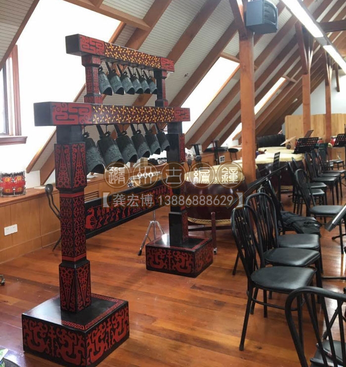 上??蛻舳ㄖ频?2件編鐘長2米、高2米、寬0.55米,分兩層懸掛了12件青銅編鐘,每件編鐘均可發(fā)出2個(gè)不同的樂音,半音齊備,采用A=440Hz標(biāo)準(zhǔn)調(diào)音,適合小型民樂團(tuán)體使用,豐富了民樂團(tuán)的整體音樂效果,從而獲得客戶的一致好評(píng)。